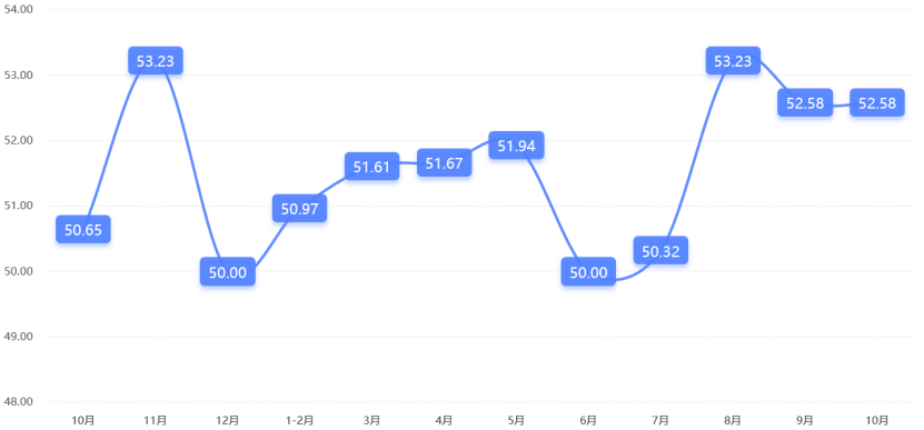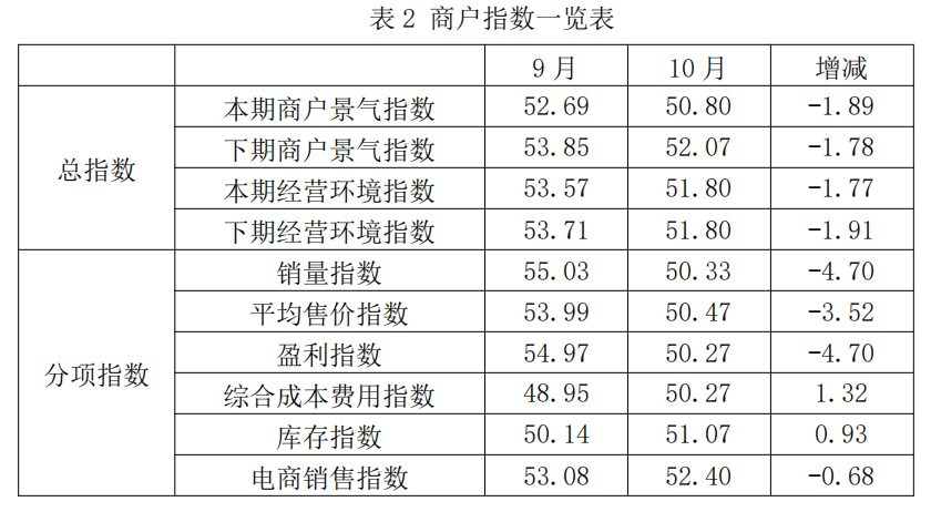 从管理者景气指数来看,总指数中,10月管理者景气指数为50.59,较上期下降1.83个百分点;经营环境指数为52.26,较上期下降2.58个百分点。分项指数中,经营总额指数为50.00,较上期下降2.58个百分点;物流发货量指数为50.00,较上期下降2.58个百分点;客流量指数为50.00,较上期下降2.90个百分点;开门率指数为50.32, 较上期下降1.94个百分点;租金指数为50.65,较上期下降0.96个百分点;电商销售指数为52.58,与上期持平。从商户景气指数来看,总指数中,10月商户景气指数为50.80,较上期下降1.89个百分点;经营环境指数为51.80,较上期下降1.77个百分点。分项指数中,销量指数为50.33,较上期下降4.70个百分点;平均售价指数为50.47,较上期下降3.52个百分点;盈利指数为50.27,较上期下降4.70个百分点;综合成本费用指数为50.27,较上期上升1.32个百分点;库存指数为51.07,较上期上升0.93个百分点;电商销售指数为52.40,较上期下降0.68个百分点。10月,经营总额下降的市场占比12.90%,较上期上升12.90个百分点;物流发货量下降的市场占比12.90%,较上期上升12.90个百分点。两项指数虽然下滑,但仍然高于50,市场经营业绩整体保持稳定向好。10月,市场整体表现持续向好。90.32%的专业市场开门率持平,较上期上升12.90个百分点;74.19%的专业市场客流量持平,较上期上升3.22个百分点;87.10%的专业市场租金持平,较上期上升3.23个百分点。10月,专业市场开门率指数、客流量指数、租金指数均基本持平,且全部维持在荣枯线50以上,反映出市场运行态势仍然稳健。10月,15.33%的专业市场商户销售总量增加,较上期下降35.72个百分点;14.67%的专业市场商户盈利增加,较上期下降36.38个百分点;16.67%的市场商户销售价格增加,较上期下降23.89个百分点。9月是专业市场黄金旺季,10月份,市场商户的各项销售数据与9月相比出现下滑,但仍然高于荣枯线50。10月,14.67%的专业市场商户经营成本减少,较上期上升13.27个百分点;18.67%的专业市场商户库存减少,较上期上升9.58个百分点。市场商户的成本费用和库存压力均减小,两项指数回升。10月,67.74%的专业市场电商销量持平,62.67%的专业市场商户电商销量持平,两项电商销售指数小幅波动,整体处于景气指数高位,显示电商销售市场整体保持稳健运行态势。数据显示,管理者方面,下期管理者景气指数为52.26,较上期下降2.90个百分点;下期经营环境指数为52.26,较上期下降2.26个百分点。商户方面,下期商户景气指数为52.07, 较上期下降1.78个百分点;下期经营环境指数为51.80,较上期下降1.91个百分点。四项预判指数均高于50,专业市场管理者和商户对11月经营信心较强。