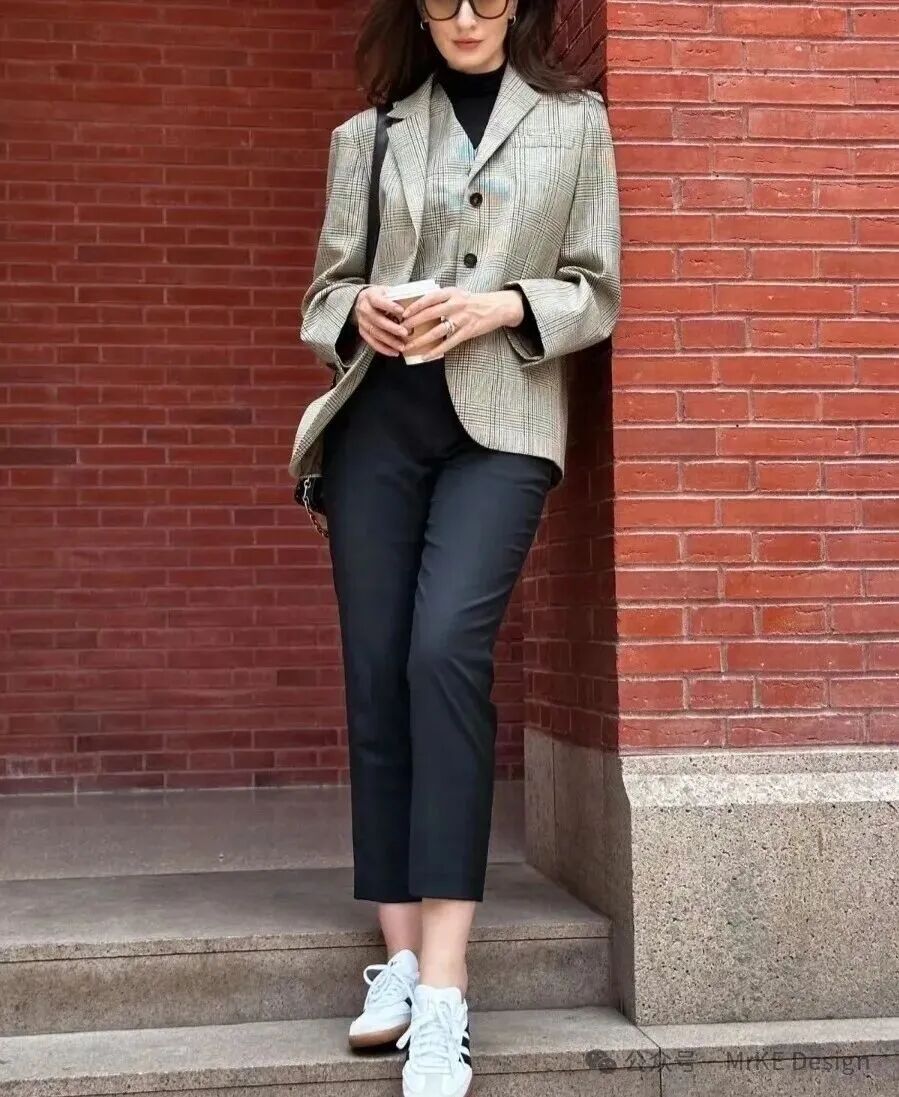 搭配公式:格纹西装 + 纯色内搭 + 纯色下装