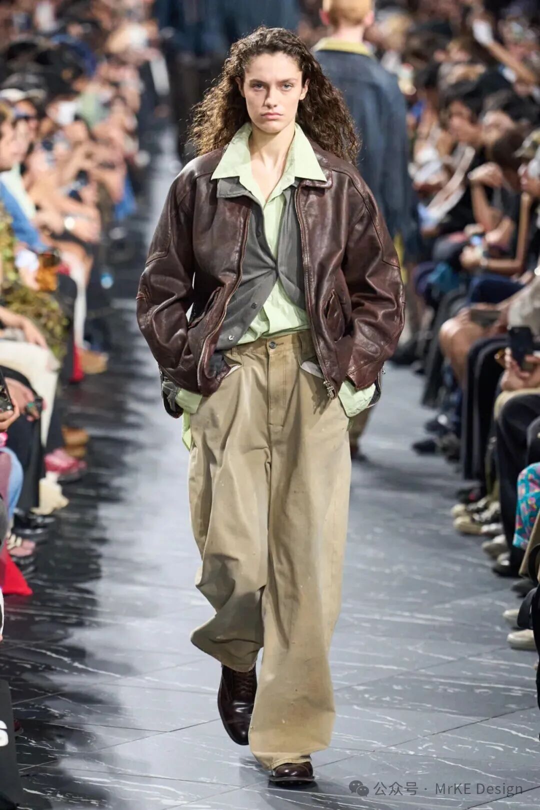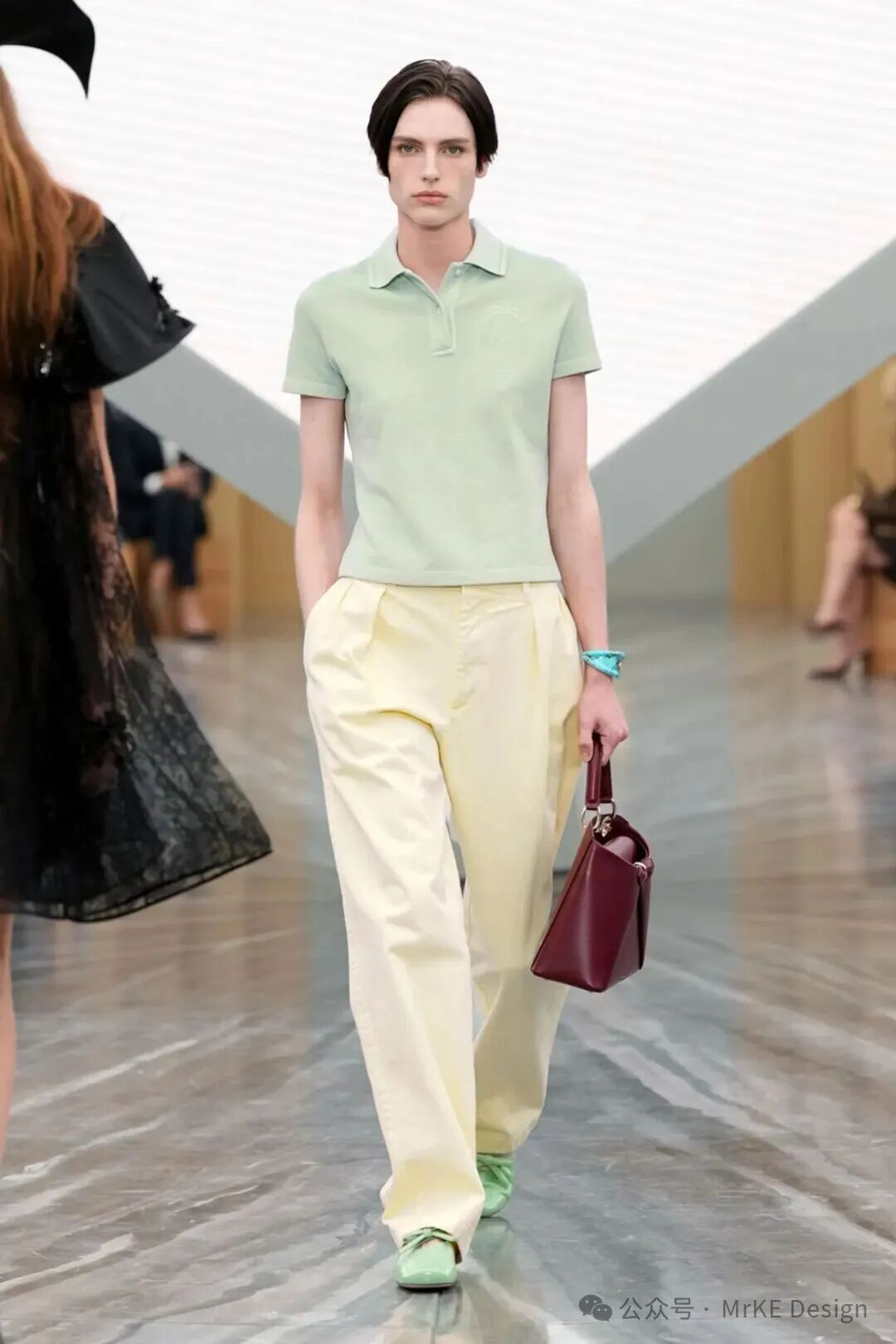 金丝雀绿(Canary Green 12 - 0108 TPG)是介于浅绿与薄荷色之间的低饱和色调,自带清新的柔雾滤镜,褪去了翠绿的浓烈感,添了几分温润雅致的质 感。既承载着绿色天然的生机与活力属性,传递对 自然的向往;又因低饱和的处理,暗含着柔和与静 谧的当代态度,契合都市人对 “疗愈感” 的追求, 成为四季里兼具自然气息与时尚格调的色彩表达载体。MKDT Studio用深棕色领边点 缀金丝雀绿宽袖收腰夹克套装, 营造出复古又雅致的风格。ANCELLM 以深棕色皮夹克,与金丝雀绿内搭相衬,硬朗与清新融合,整套搭配呈现出一种率性 又不失灵动的氛围感,适合街头出街或潮流聚会; Christian Dior 用金丝雀绿 Polo 衫搭配淡黄色阔腿裤,清新色调和谐相融,再以绿色鞋子呼应,在色彩上起到呼应和增强整体感的作用; Alberta Ferretti 上半身的金丝 雀绿褶皱上衣与浅粉色飘逸长裙搭配,绿色的清新明快与温柔粉 色相结合,营造浪漫柔美的度假氛围。以金丝雀绿连衣裙、西装等奠定清新基调,棕褐上衣、卡其裤装增添复古感的沉稳雅致,米色配饰中和清爽感,适配通勤、轻度假等场景,打造兼具自然灵动与复古格调 的通勤轻度假风春夏穿搭。用用金丝雀绿上衣、西装等奠定清透基调,浅粉裙装、裤装增添柔美浪漫感,冰蓝配饰丰富层次,适配春日约会、休闲逛街等场景,打造兼具清新雅致与温柔氛围的清透浅春系穿搭。