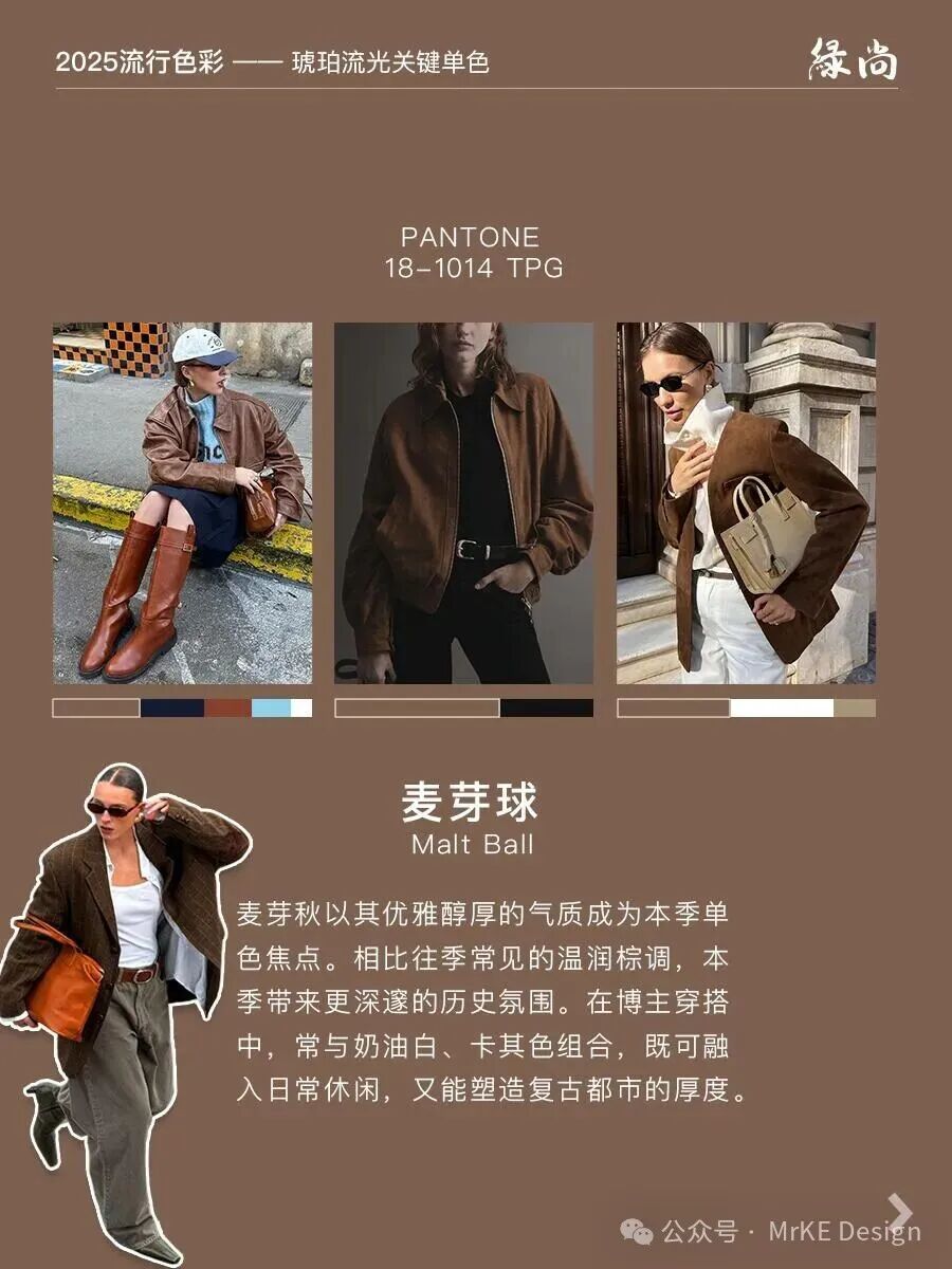 「琥珀流光」灵感源于Shim-mercore,Shimmer 的基础词义为“微光、闪烁",在文学表达中,常被喻指生机、能量,指引闪着希望之光的方向。该风格旨在琥珀色、棕色系基调上,注入灵动的亮色内搭、光泽材质或配饰点缀,从而带来更具活力与能量的秋冬叙事。