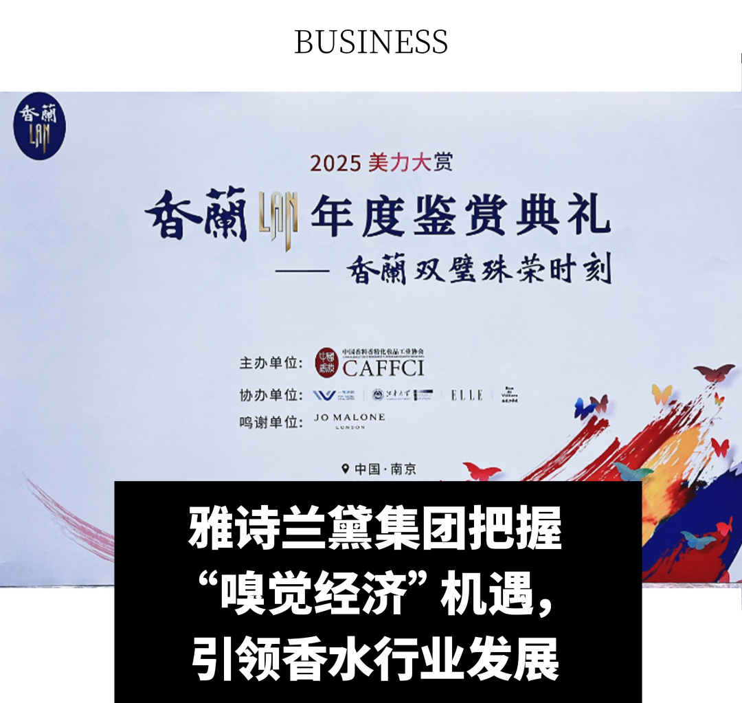 2025 年 9 月 29 日,由中国香料香精化妆品工业协会主办,雅诗兰黛集团旗下经典香氛品牌祖·玛珑(Jo Malone London)支持的首届香蘭LAN年度鉴赏典礼“香蘭双璧殊荣时刻”近日在南京圆满收官。本次活动共吸引了 40 多个国内外品牌参与,并汇聚了行业权威专家、知名评香人与品牌代表,共同见证了一场以香气为载体的专业交流与美学盛典。作为高端奢华香水的市场领导者,雅诗兰黛集团始终以消费者为中心,促进、支持和推动行业交流及共赢,同时深挖“嗅觉经济”的巨大潜力与价值,不断完善多元矩阵和消费体验,并致力于多维度创新,积极引领香水行业的高品质发展。