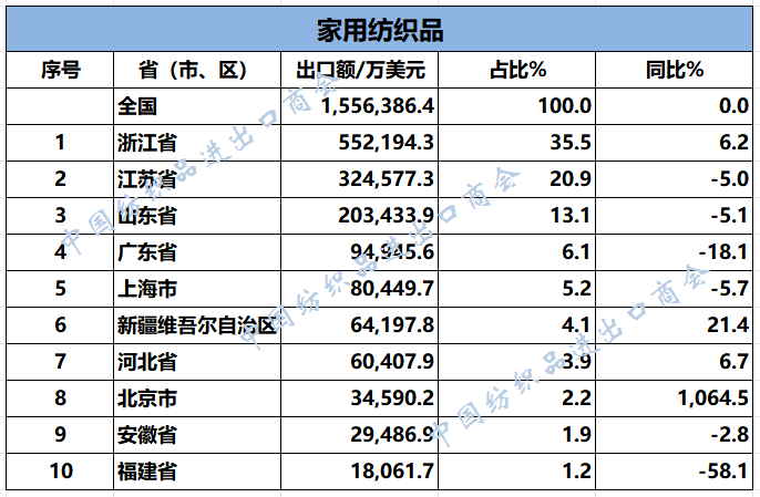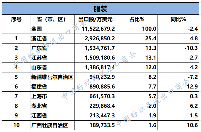 2025年1-9月,我国纺织服装累计出口2217.22亿美元,同比下降0.3%。浙江省、江苏省、广东省、山东省、福建省分别列全国纺织服装出口省市前五位,合计比重超七成。