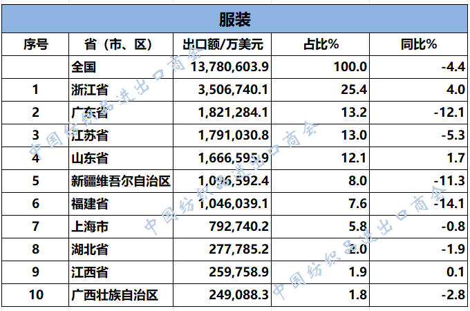 2025年1-10月中国服装出口分析