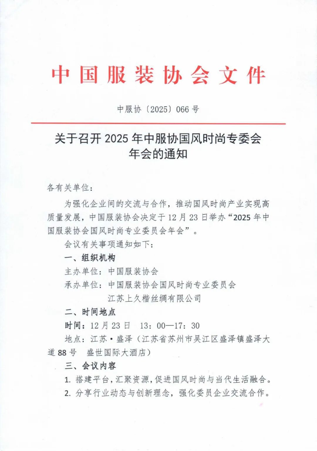 为强化企业间的交流与合作,推动国风时尚产业实现高质量发展,中国服装协会决定于12月23日召开“2025年中国服装协会国风时尚专业委员会年会”。