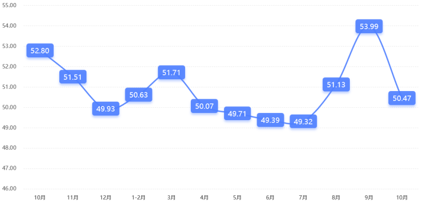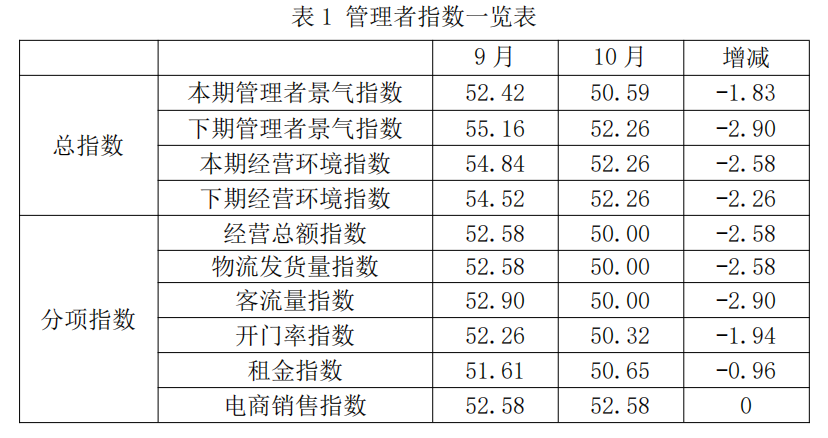 从管理者景气指数来看,总指数中,10月管理者景气指数为50.59,较上期下降1.83个百分点;经营环境指数为52.26,较上期下降2.58个百分点。分项指数中,经营总额指数为50.00,较上期下降2.58个百分点;物流发货量指数为50.00,较上期下降2.58个百分点;客流量指数为50.00,较上期下降2.90个百分点;开门率指数为50.32, 较上期下降1.94个百分点;租金指数为50.65,较上期下降0.96个百分点;电商销售指数为52.58,与上期持平。从商户景气指数来看,总指数中,10月商户景气指数为50.80,较上期下降1.89个百分点;经营环境指数为51.80,较上期下降1.77个百分点。分项指数中,销量指数为50.33,较上期下降4.70个百分点;平均售价指数为50.47,较上期下降3.52个百分点;盈利指数为50.27,较上期下降4.70个百分点;综合成本费用指数为50.27,较上期上升1.32个百分点;库存指数为51.07,较上期上升0.93个百分点;电商销售指数为52.40,较上期下降0.68个百分点。10月,经营总额下降的市场占比12.90%,较上期上升12.90个百分点;物流发货量下降的市场占比12.90%,较上期上升12.90个百分点。两项指数虽然下滑,但仍然高于50,市场经营业绩整体保持稳定向好。10月,市场整体表现持续向好。90.32%的专业市场开门率持平,较上期上升12.90个百分点;74.19%的专业市场客流量持平,较上期上升3.22个百分点;87.10%的专业市场租金持平,较上期上升3.23个百分点。10月,专业市场开门率指数、客流量指数、租金指数均基本持平,且全部维持在荣枯线50以上,反映出市场运行态势仍然稳健。10月,15.33%的专业市场商户销售总量增加,较上期下降35.72个百分点;14.67%的专业市场商户盈利增加,较上期下降36.38个百分点;16.67%的市场商户销售价格增加,较上期下降23.89个百分点。9月是专业市场黄金旺季,10月份,市场商户的各项销售数据与9月相比出现下滑,但仍然高于荣枯线50。10月,14.67%的专业市场商户经营成本减少,较上期上升13.27个百分点;18.67%的专业市场商户库存减少,较上期上升9.58个百分点。市场商户的成本费用和库存压力均减小,两项指数回升。10月,67.74%的专业市场电商销量持平,62.67%的专业市场商户电商销量持平,两项电商销售指数小幅波动,整体处于景气指数高位,显示电商销售市场整体保持稳健运行态势。数据显示,管理者方面,下期管理者景气指数为52.26,较上期下降2.90个百分点;下期经营环境指数为52.26,较上期下降2.26个百分点。商户方面,下期商户景气指数为52.07, 较上期下降1.78个百分点;下期经营环境指数为51.80,较上期下降1.91个百分点。四项预判指数均高于50,专业市场管理者和商户对11月经营信心较强。