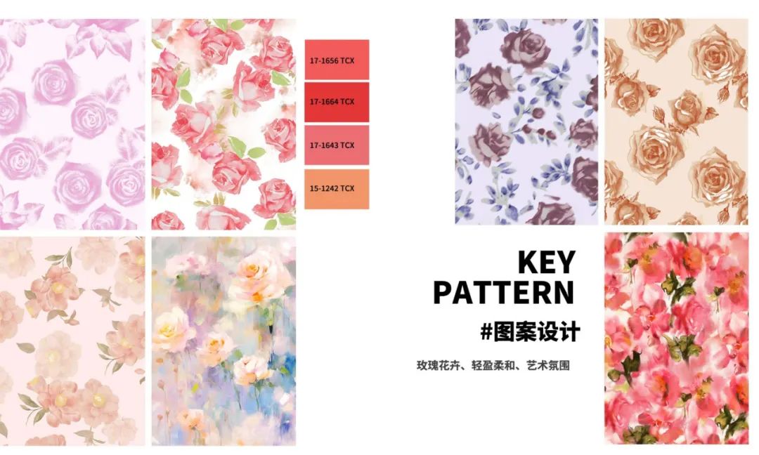 '玫瑰之韵'的设计理念,以玫瑰花卉为核心,将传统图案赋予全新的诠释。设计师摒弃了繁复的细节,转而追求简约而艺术化的处理,通过巧妙地运用抽象手法,使玫瑰花的形态变得更加柔和且轻盈。模糊的线条和轮廓创造出一种梦幻般的视觉效果,如同玫瑰花瓣在微风中轻轻飘动,赋予服装作品一种朦胧而优雅的浪漫气息。