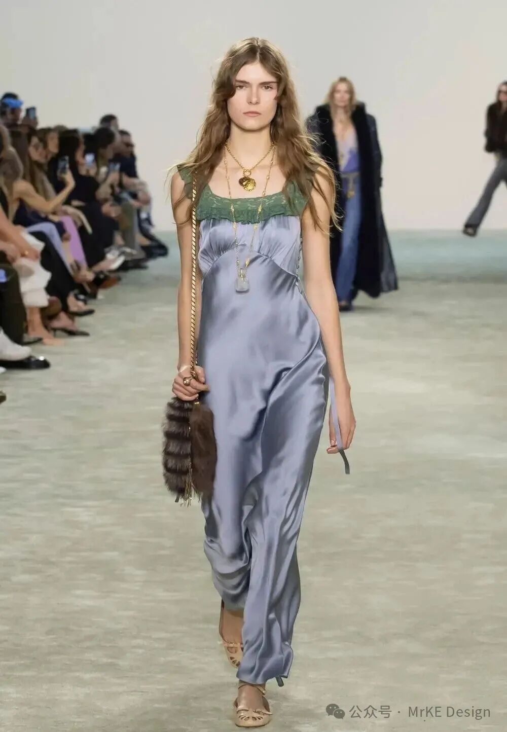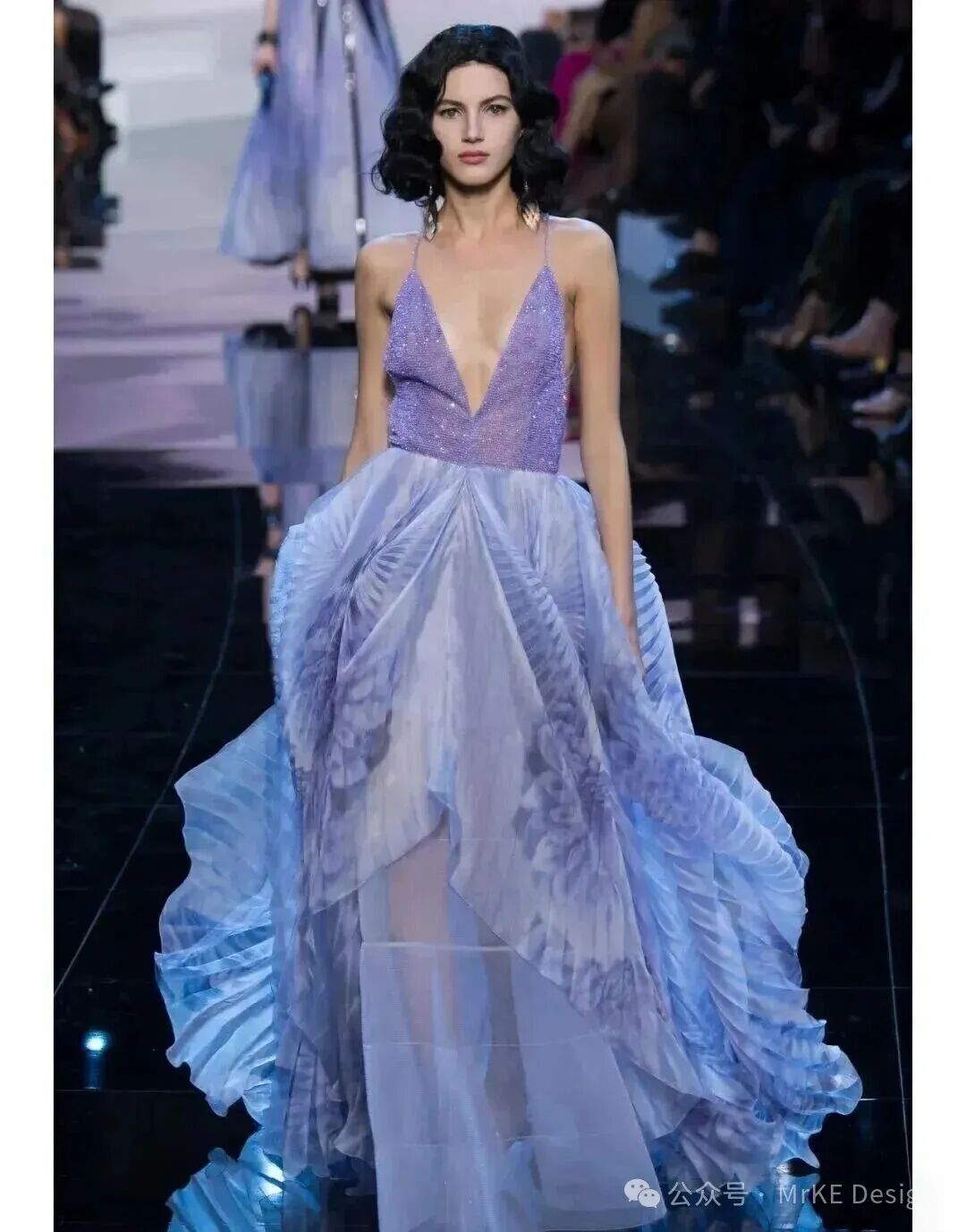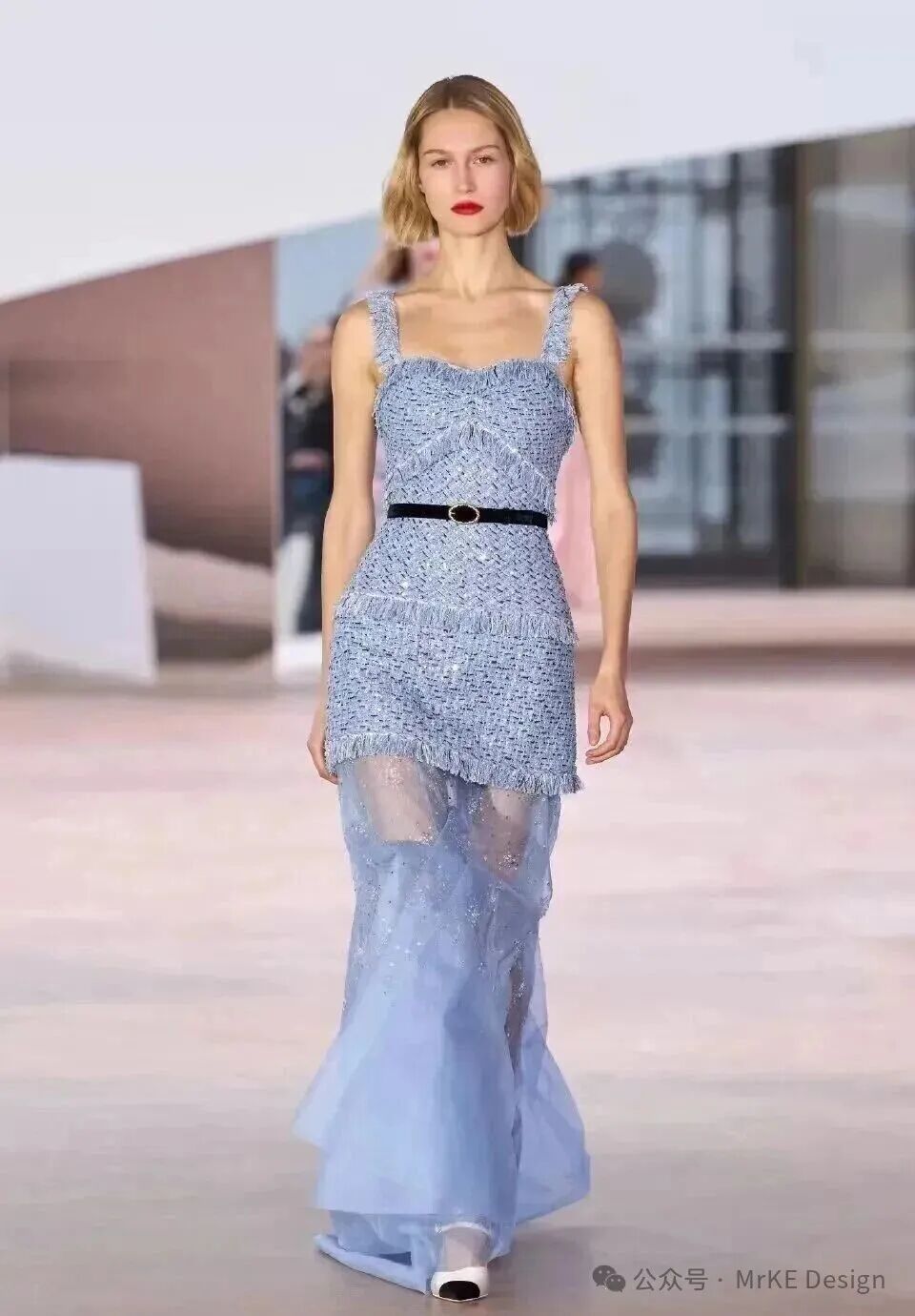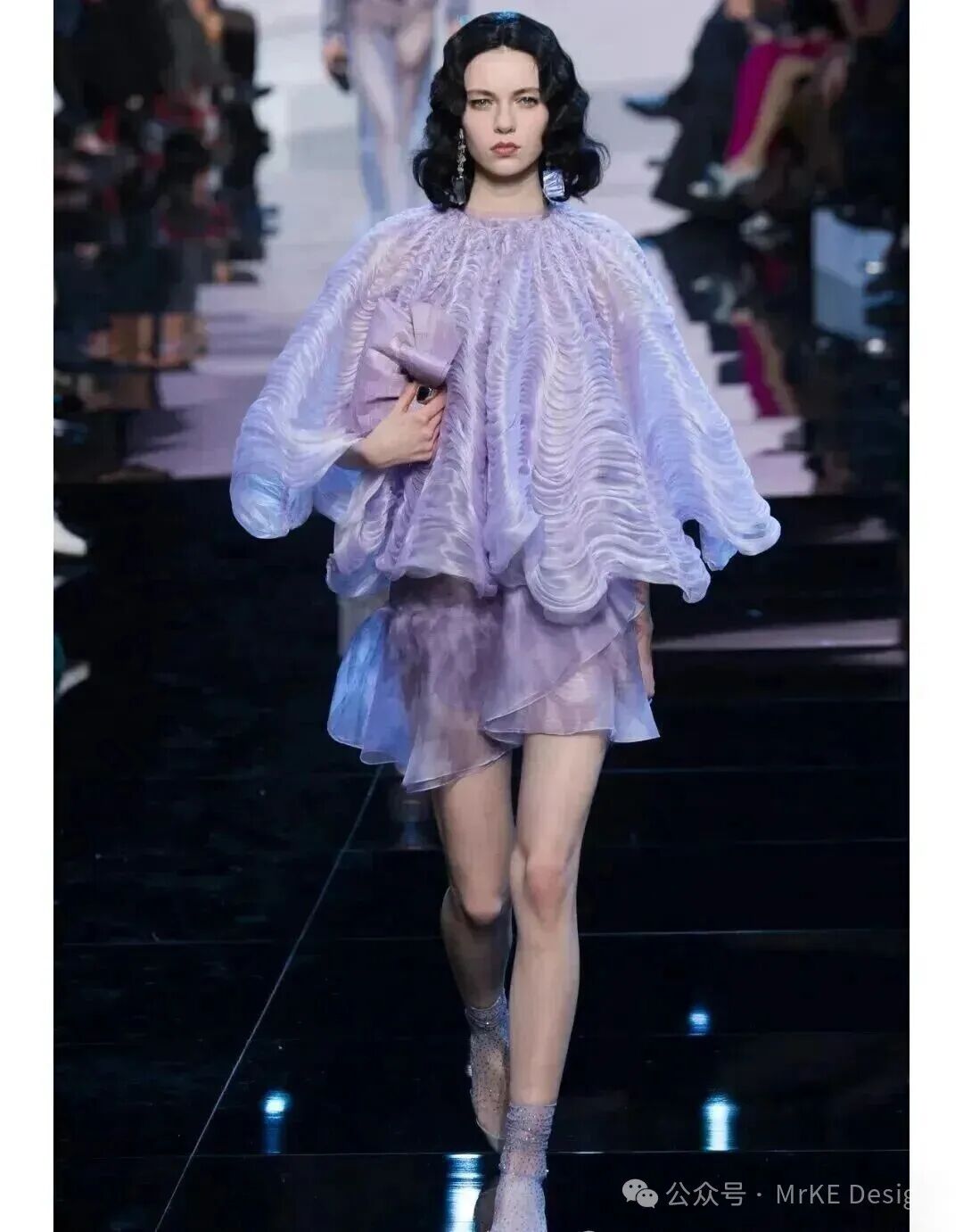 薰衣草蓝是一种带有淡紫色调的空灵蓝色,呈现出轻盈而无拘无束的质感。其朦胧的蒸气感与乳白色交织,为秋冬系列注入一丝宁静与放松的氛围。这种色彩不仅适用于针织单品和飘逸面料,还能通过层叠搭配强化整体造型的柔和感,成为连接自然与都市风格的桥梁。