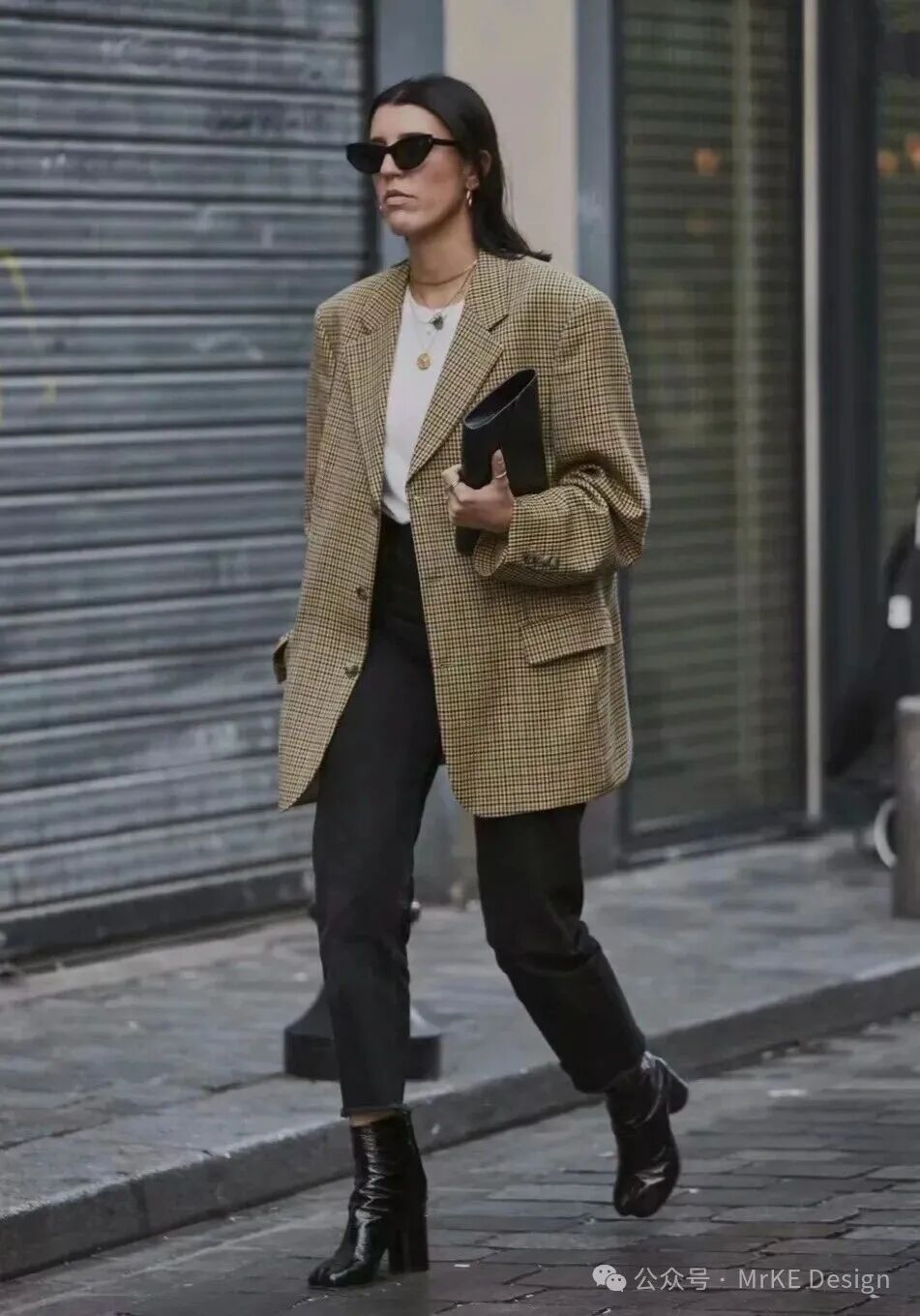 搭配公式:格纹西装 + 纯色内搭 + 纯色下装