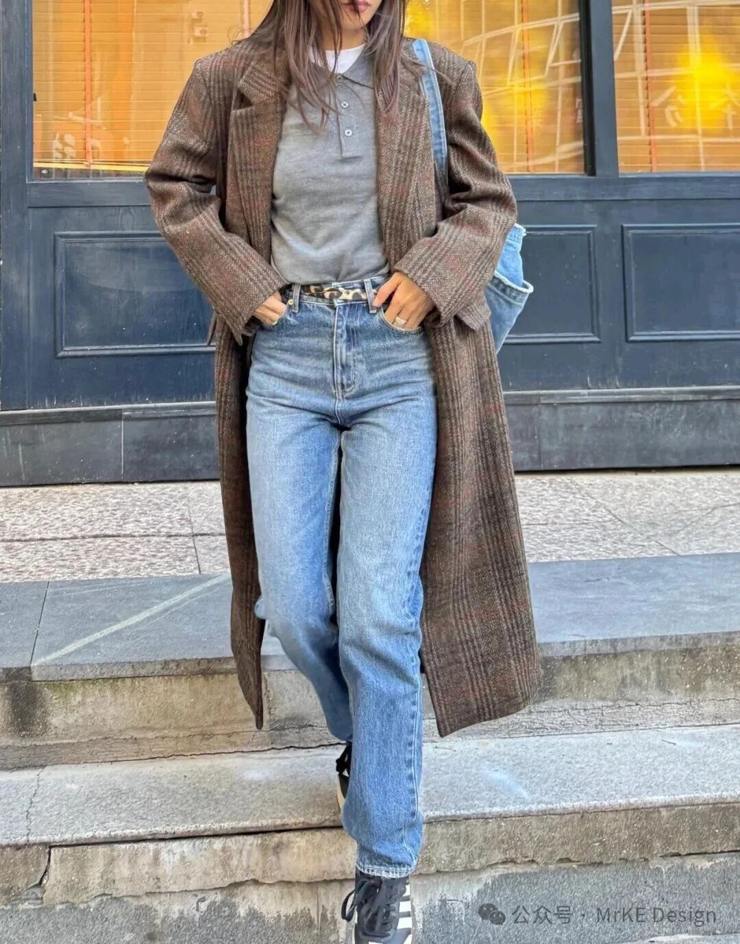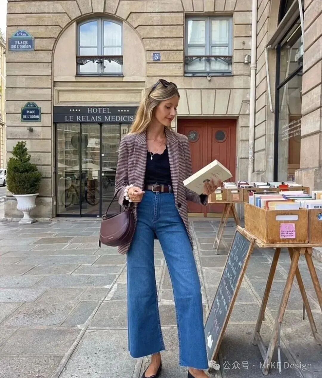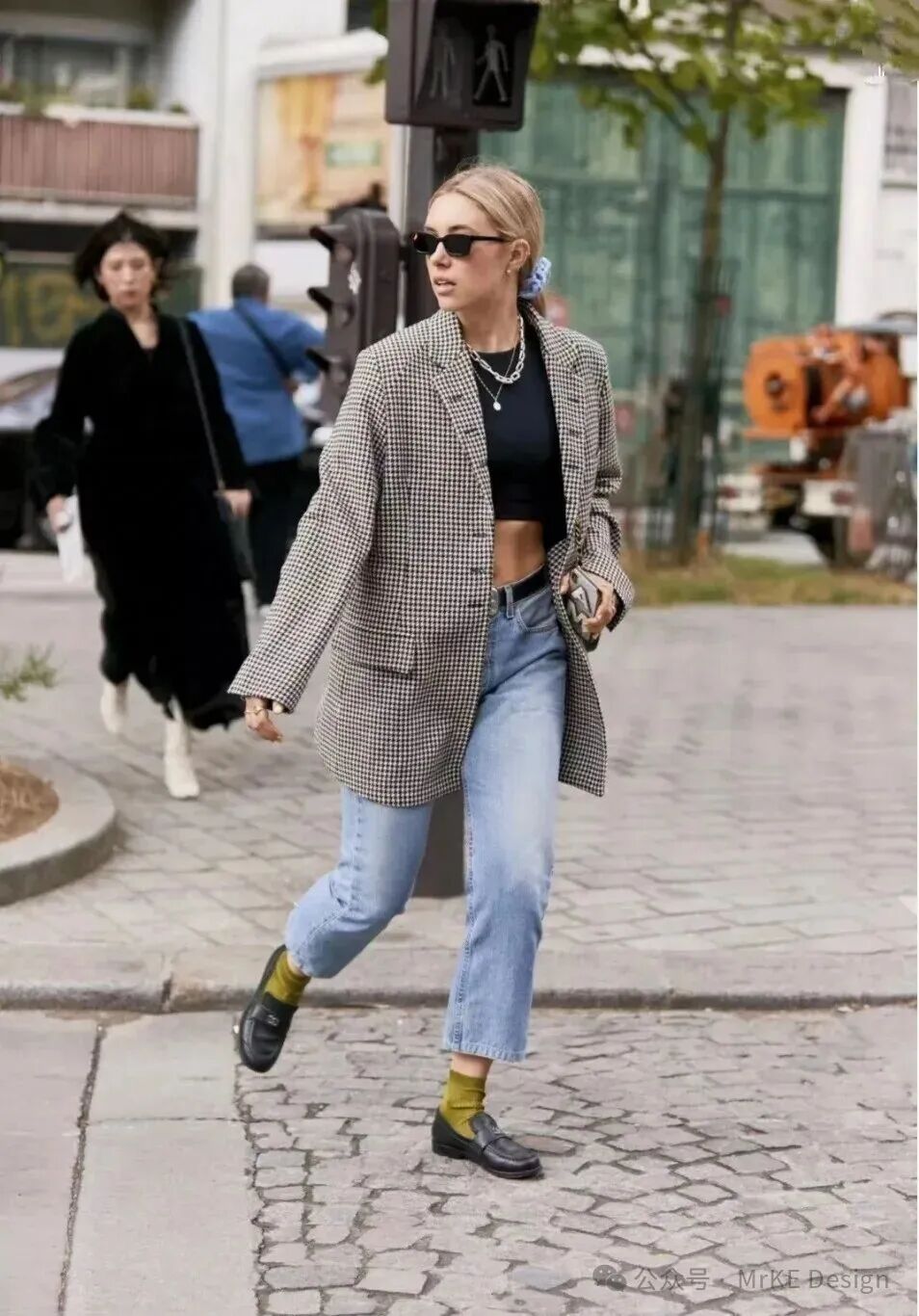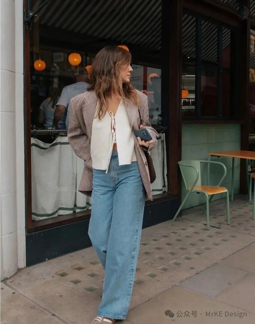 蓝色直筒牛仔裤: 混搭的精髓,用牛仔的休闲感平衡西装的正式,最时髦。