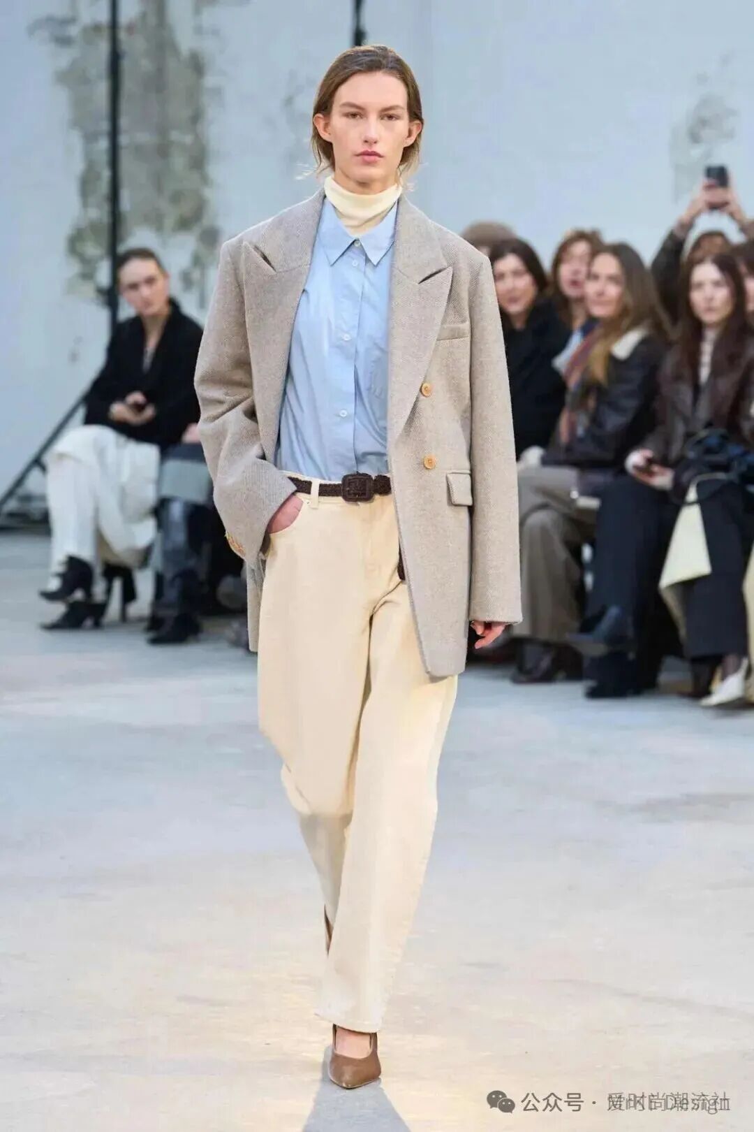 于是,衬衫“借用”了男士的衣橱,领带滑落于超大号衬衫之下,半身裙与运动T恤相配,鞋子则骄傲地展现着岁月的痕迹,搭配着并不追求完美对称的袜子。这种“凌乱”并非疏忽,而是一种视觉语言:设计师通过层叠的方式,将不同时代和风格的衣橱单品组合在一起,讲述着一个故事。