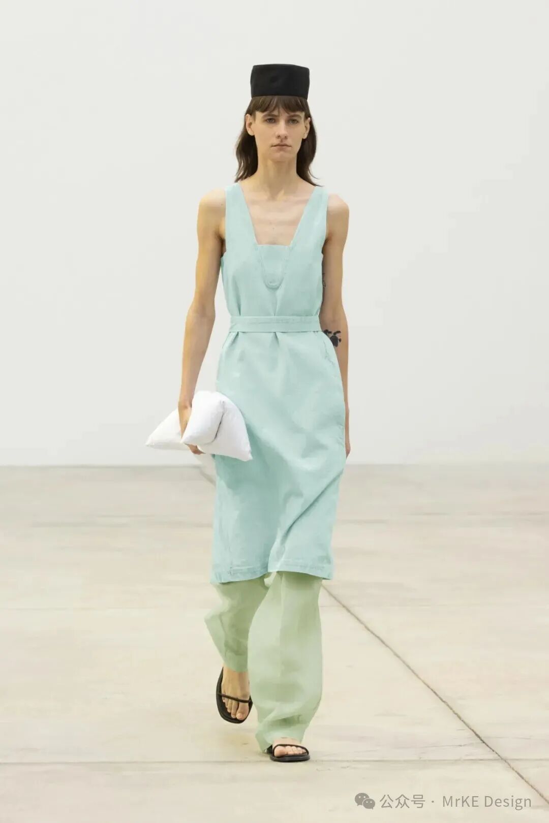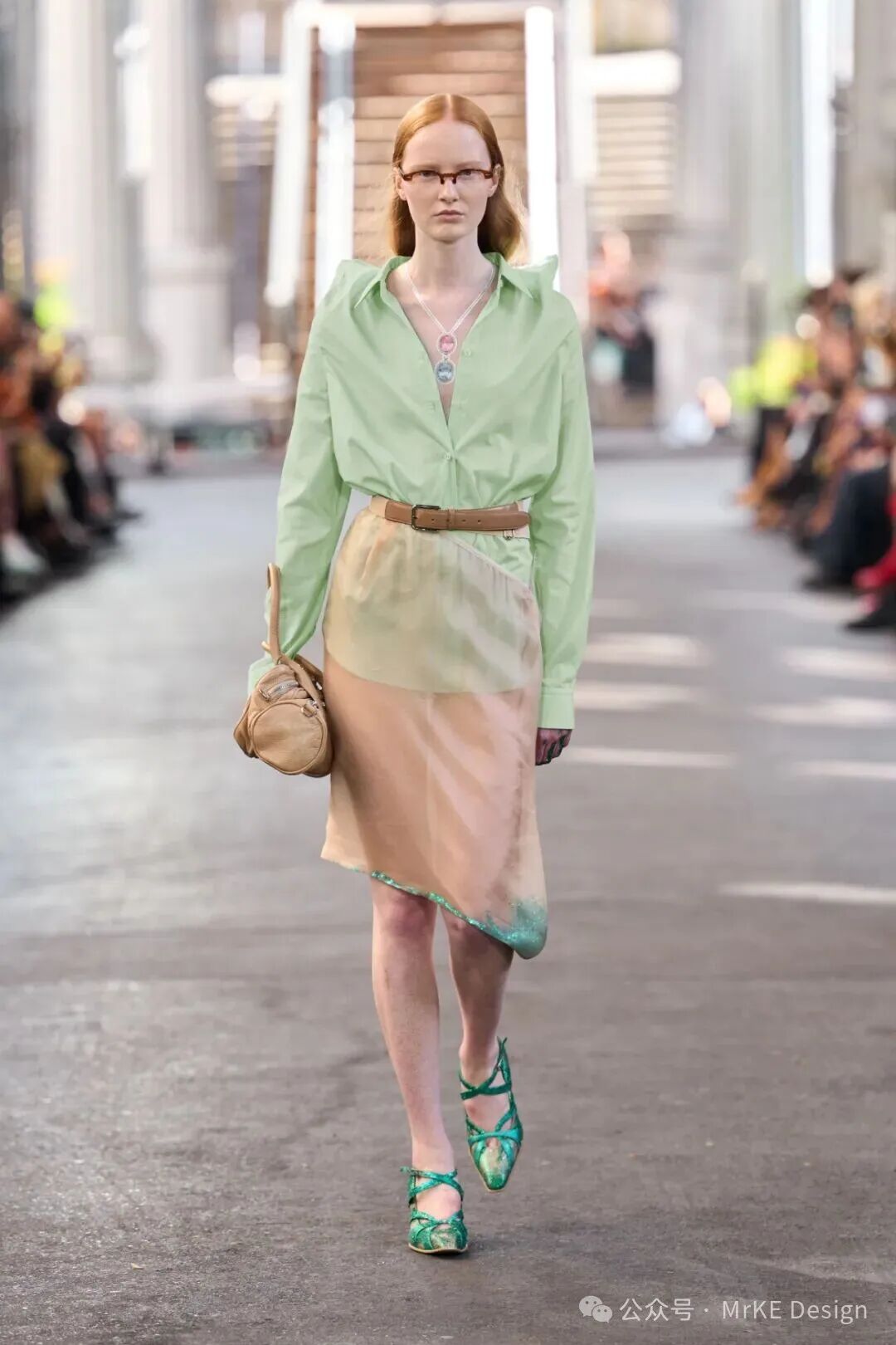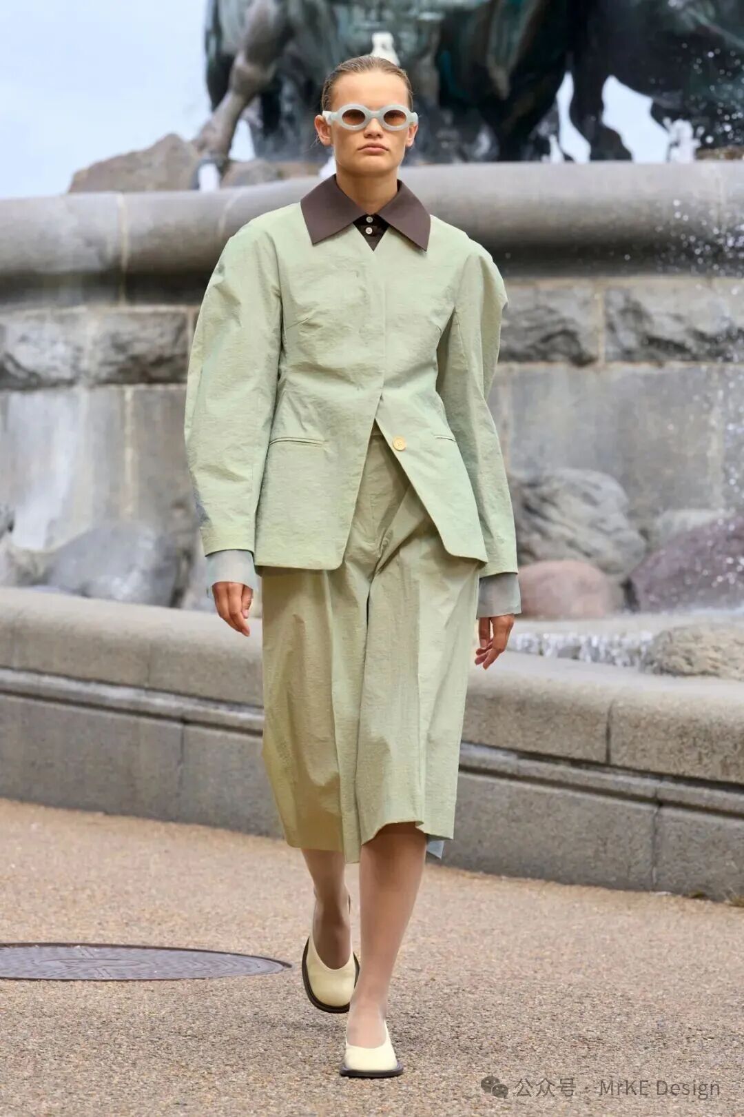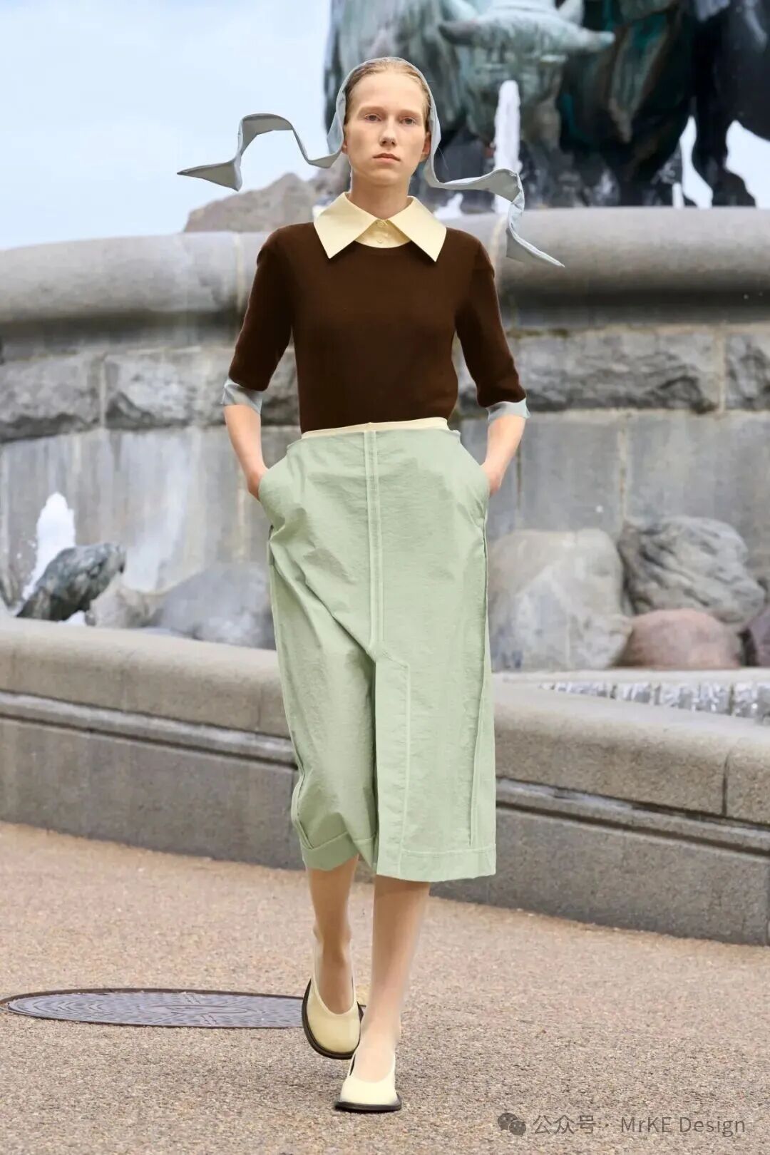 金丝雀绿(Canary Green 12 - 0108 TPG)是介于浅绿与薄荷色之间的低饱和色调,自带清新的柔雾滤镜,褪去了翠绿的浓烈感,添了几分温润雅致的质 感。既承载着绿色天然的生机与活力属性,传递对 自然的向往;又因低饱和的处理,暗含着柔和与静 谧的当代态度,契合都市人对 “疗愈感” 的追求, 成为四季里兼具自然气息与时尚格调的色彩表达载体。MKDT Studio用深棕色领边点 缀金丝雀绿宽袖收腰夹克套装, 营造出复古又雅致的风格。ANCELLM 以深棕色皮夹克,与金丝雀绿内搭相衬,硬朗与清新融合,整套搭配呈现出一种率性 又不失灵动的氛围感,适合街头出街或潮流聚会; Christian Dior 用金丝雀绿 Polo 衫搭配淡黄色阔腿裤,清新色调和谐相融,再以绿色鞋子呼应,在色彩上起到呼应和增强整体感的作用; Alberta Ferretti 上半身的金丝 雀绿褶皱上衣与浅粉色飘逸长裙搭配,绿色的清新明快与温柔粉 色相结合,营造浪漫柔美的度假氛围。以金丝雀绿连衣裙、西装等奠定清新基调,棕褐上衣、卡其裤装增添复古感的沉稳雅致,米色配饰中和清爽感,适配通勤、轻度假等场景,打造兼具自然灵动与复古格调 的通勤轻度假风春夏穿搭。用用金丝雀绿上衣、西装等奠定清透基调,浅粉裙装、裤装增添柔美浪漫感,冰蓝配饰丰富层次,适配春日约会、休闲逛街等场景,打造兼具清新雅致与温柔氛围的清透浅春系穿搭。