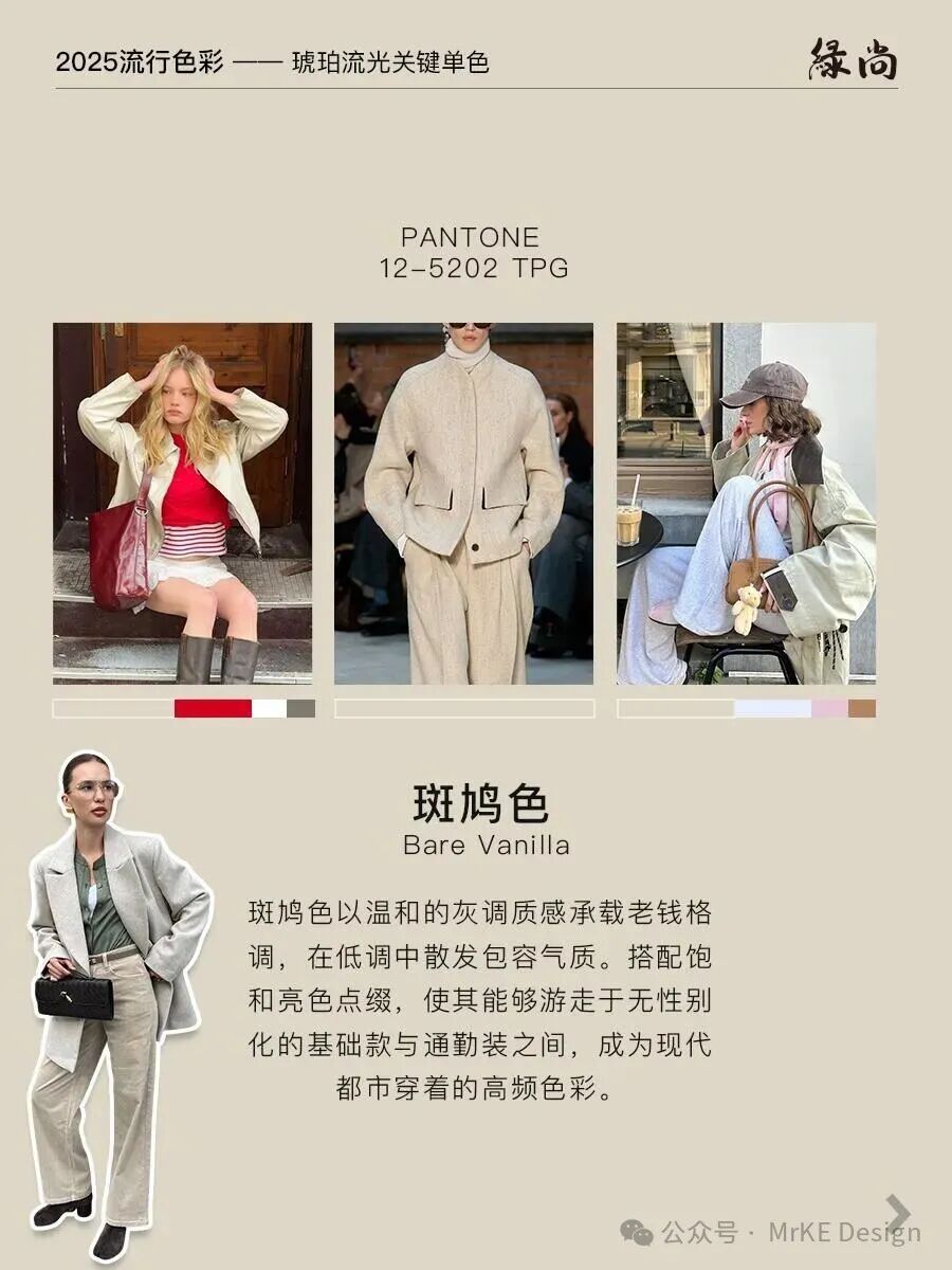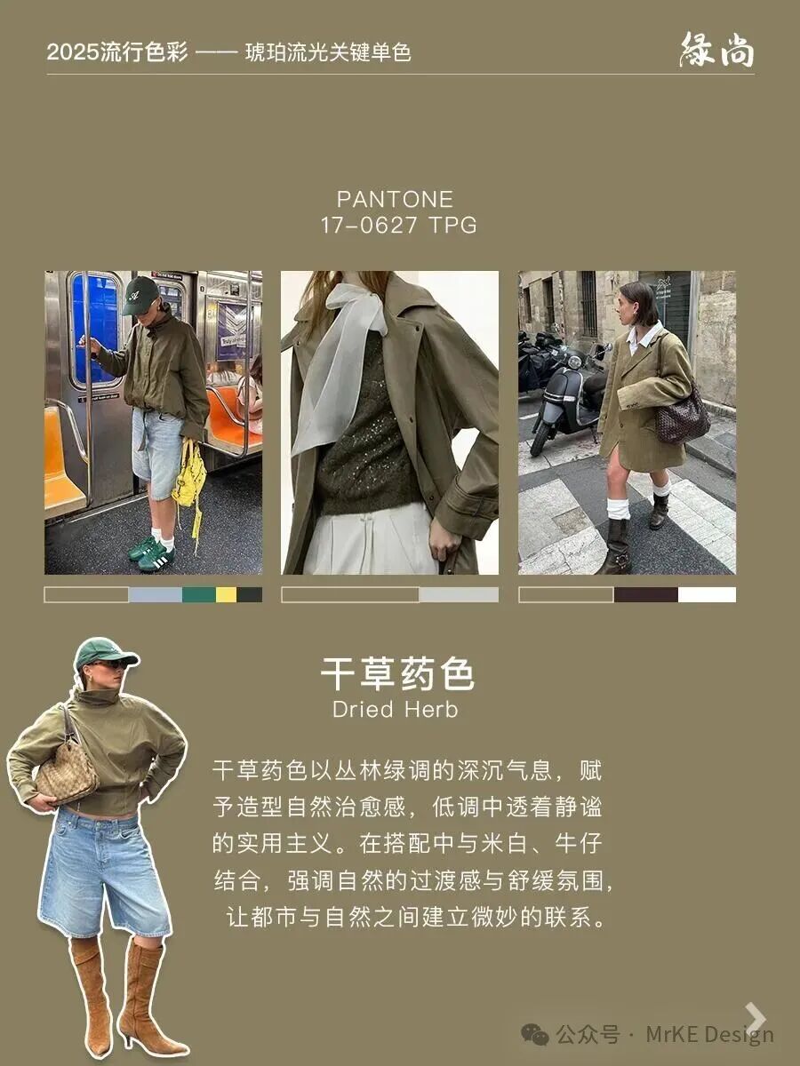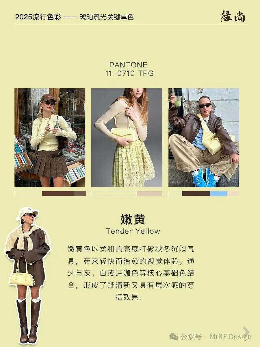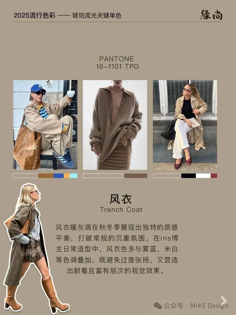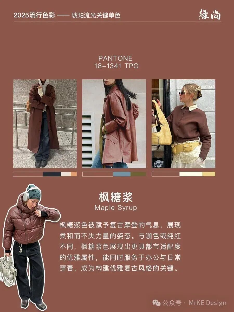 「琥珀流光」灵感源于Shim-mercore,Shimmer 的基础词义为“微光、闪烁",在文学表达中,常被喻指生机、能量,指引闪着希望之光的方向。该风格旨在琥珀色、棕色系基调上,注入灵动的亮色内搭、光泽材质或配饰点缀,从而带来更具活力与能量的秋冬叙事。