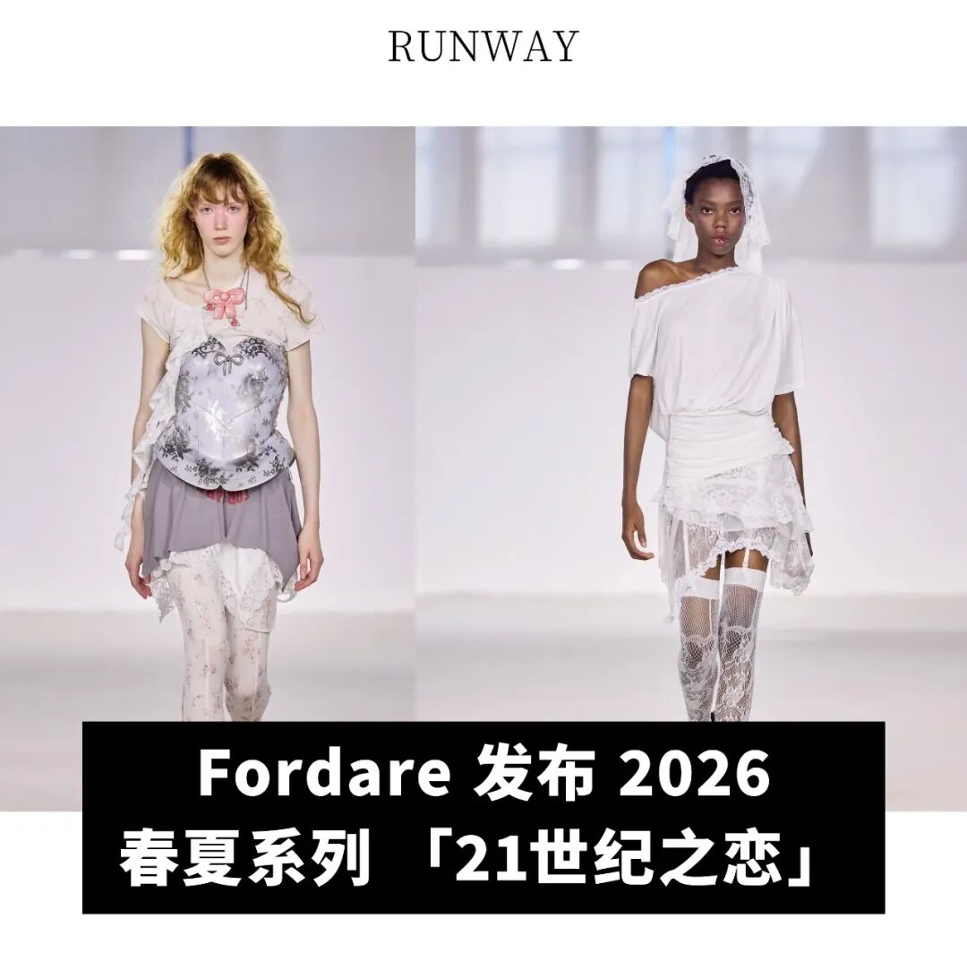 独立设计师品牌 Fordare 于上海时装周期间发布 2026 春夏系列 「21世纪之恋」。在快节奏的当代语境里,“价值互换”逐渐成为恋爱关系的隐形标签,彼此物化,灵性的共鸣被简化为条件的匹配。看似亲密的联结下,实际内心封闭疏离。Fordare 26SS「21世纪之恋」主题系列,以对当下 dating 时代清醒的观察为起点,希望用设计打破刻板印象:蕾丝与漫画元素巧妙融合,将恋爱中的浪漫气息悄然释放;而对蕾丝与运动元素的解构重组,也正是 Fordare 极具辨识度的经典设计语言;Slogan T恤系列传递多元态度——略带调侃的趣味表达“love is ok”、“塑料关系”;也有“best woman”、“永远的爱”所承载的真诚期许。3D 打印胸衣凭借独特造型,诠释出本季主题下强大的纯爱战士形象。此外,本次秀场携手陶瓷品牌 it doesnot matter,共同探索配饰领域的新可能。