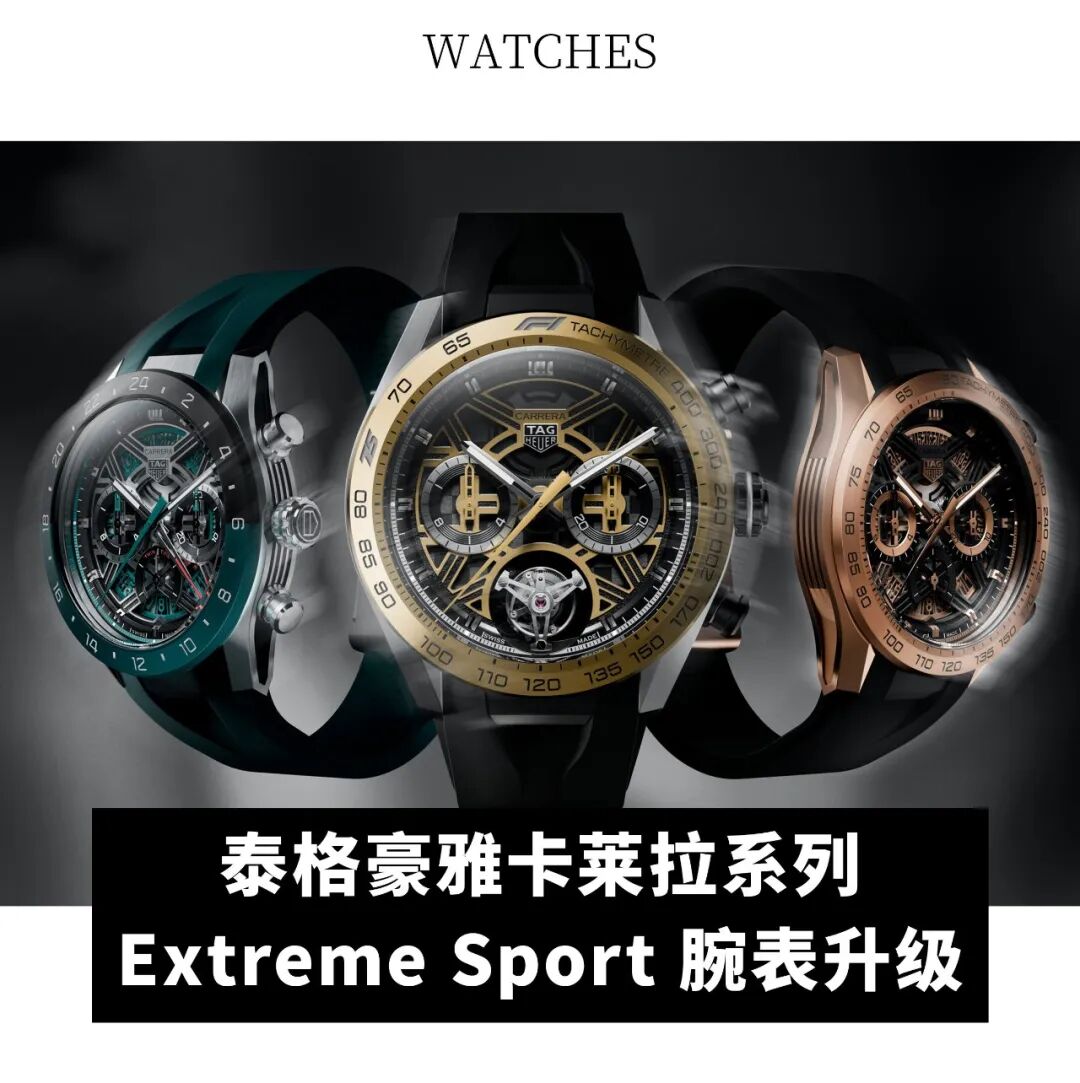 泰格豪雅于 2025 年持续革新卡莱拉系列 Extreme Sport 腕表,呈现两款新作——泰格豪雅卡莱拉系列 Extreme Sport 双时区计时码表与泰格豪雅卡莱拉系列 Extreme Sport 玫瑰金款计时码表,以创新功能设计与突破性美学语言,续写赛车精神的时计传奇。泰格豪雅卡莱拉系列 Extreme Sport 双时区计时码表以突破性功能设计再创制表新境,首次搭载两地时功能,以鲜明设计语言重塑时区美学。品牌首次采用单块双色陶瓷打造一体式表圈,成就制表工艺与美学设计的双重突破。全新推出的泰格豪雅卡莱拉系列 Extreme Sport 计时码表表壳与表圈均采用 18K 玫瑰金一体铸造,玫瑰金表壳经磨砂与抛光工艺交替处理,光影流转间凸显了泰格豪雅卡莱拉系列标志性的几何线条。精美的润饰工艺不仅营造出鲜明的视觉对比与深邃层次感,更为时计轮廓注入雕塑般的张力。