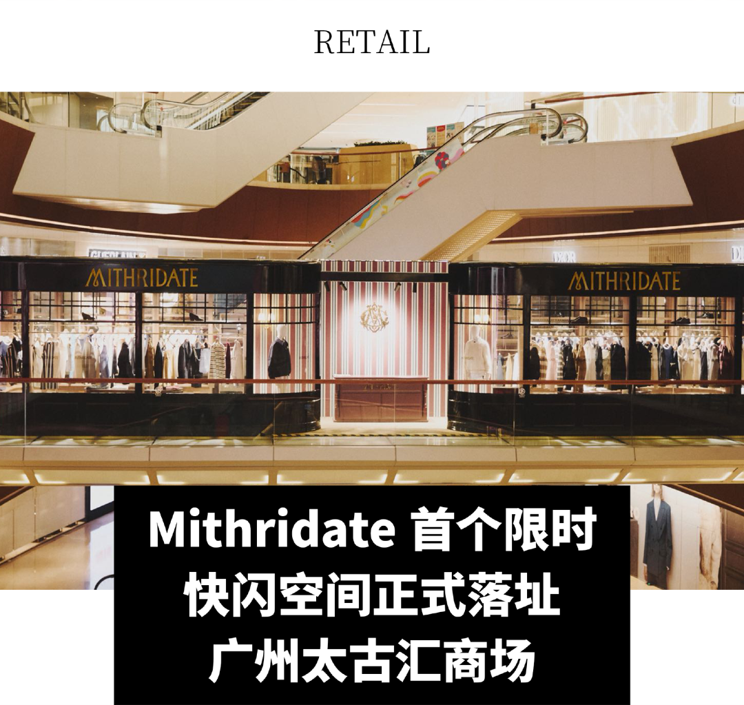 Mithridate欣然宣布,品牌首个限时快闪空间正式落址广州太古汇商场。 此次全新概念快闪空间的推出,是Mithridate发展历程中的重要里程碑。今年年 初,品牌正式迎来了英国创意总监Daniel Fletcher的加入。他以深厚的英国文化底 蕴重塑品牌DNA,让设计叙事从产品延伸至空间,打造出更具整体性的品牌体验。