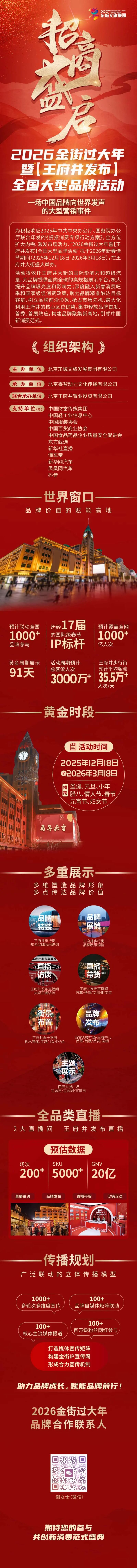 在国家"十五五"品牌升级与消费提振的双重机遇下, “2026金街过大年暨【王府井发布】全国大型品牌活动”,拟于2025年12月18日-2026年3月18日举办,由北京东城文旅发展集团有限公司主办,北京睿智动力文化传播有限公司承办,中国财富传媒集团、中国轻工业信息中心、中国服装协会、中国百货商业协会、中国食品药品企业质量安全促进会、抖音、东方甄选等多家单位支持,以“万马奔腾 福满金街”为主题,横跨包含元旦、春节、元宵等多个节日的13个黄金消费周,预计将吸引超3000万线下客流,聚集文创、潮玩、汽车、酒水、食品、电器、服装、服饰、珠宝、化妆品、全国优秀文旅等领域优秀品牌及创新品牌代表。