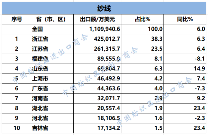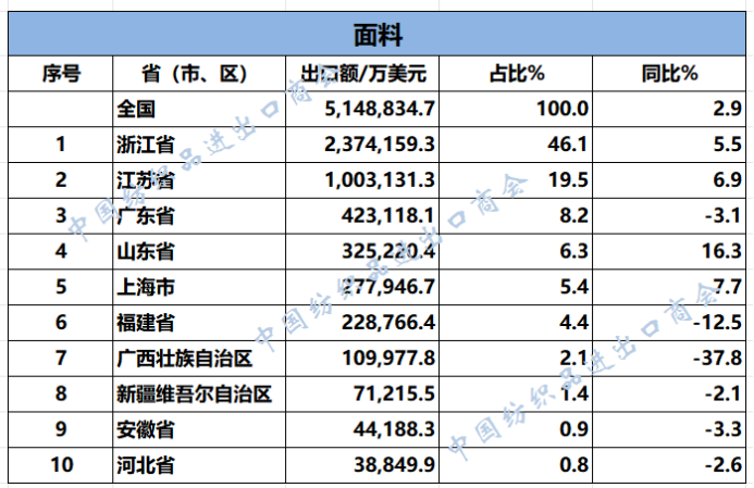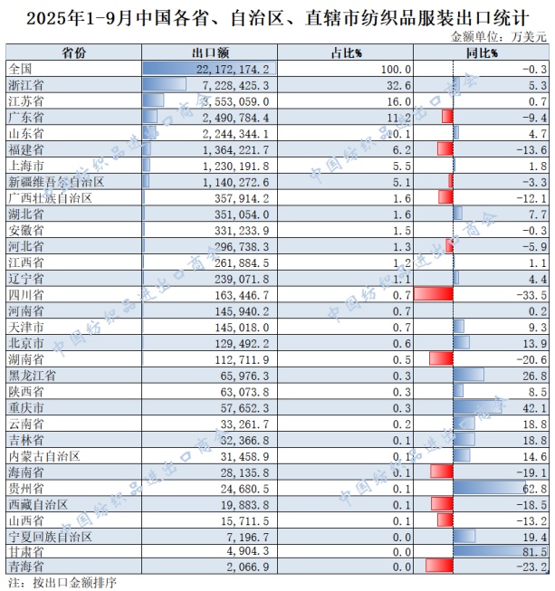 2025年1-9月,我国纺织服装累计出口2217.22亿美元,同比下降0.3%。浙江省、江苏省、广东省、山东省、福建省分别列全国纺织服装出口省市前五位,合计比重超七成。