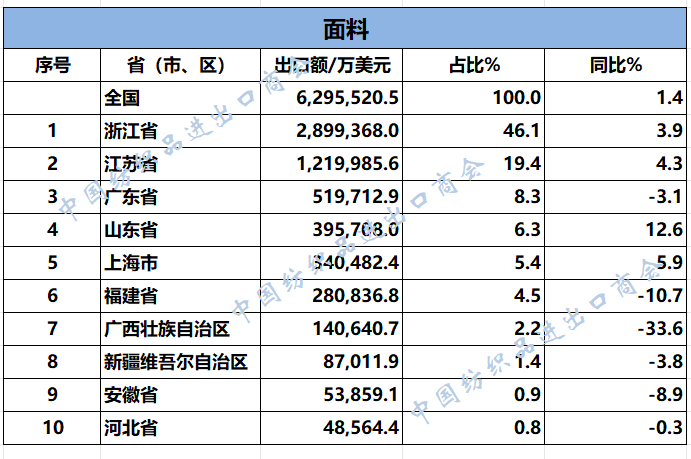 2025年1-11月,我国纺织服装累计出口2678.18亿美元,同比下降1.9%。浙江省、江苏省、广东省、山东省、福建省分别列全国纺织服装出口省市前五位,合计比重超七成。