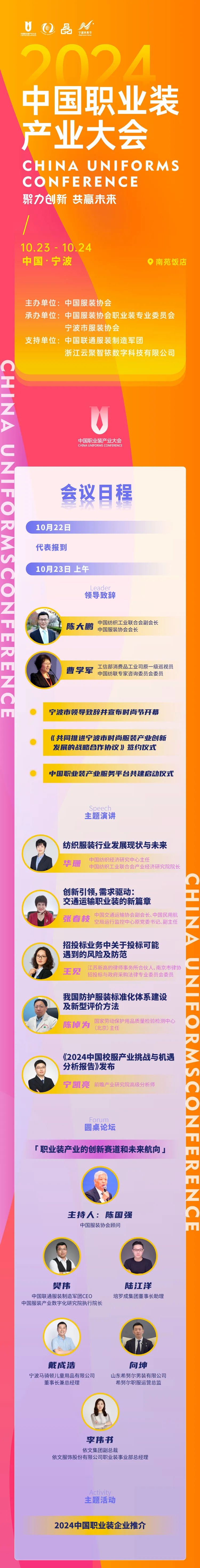2024中国职业装产业大会旨在着力推进职业装全产业链协作与创新,打造智慧碰撞、方向指引、展示交流、对接洽谈于一体的综合性服务平台,为行业的创新发展提供强大的智力支持和动力源泉,推动职业装产业高质量发展。特在10月23日下午举办服装行业优质供应链资源对接活动及展示空间。